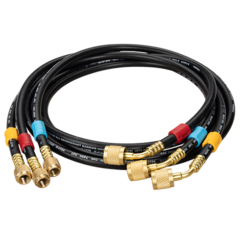 The Fieldpiece HR1LM is a premium, vacuum-rated hose with a low-loss valve and includes customizable hose colour tags to enable easy interchanging of system connection and identification.