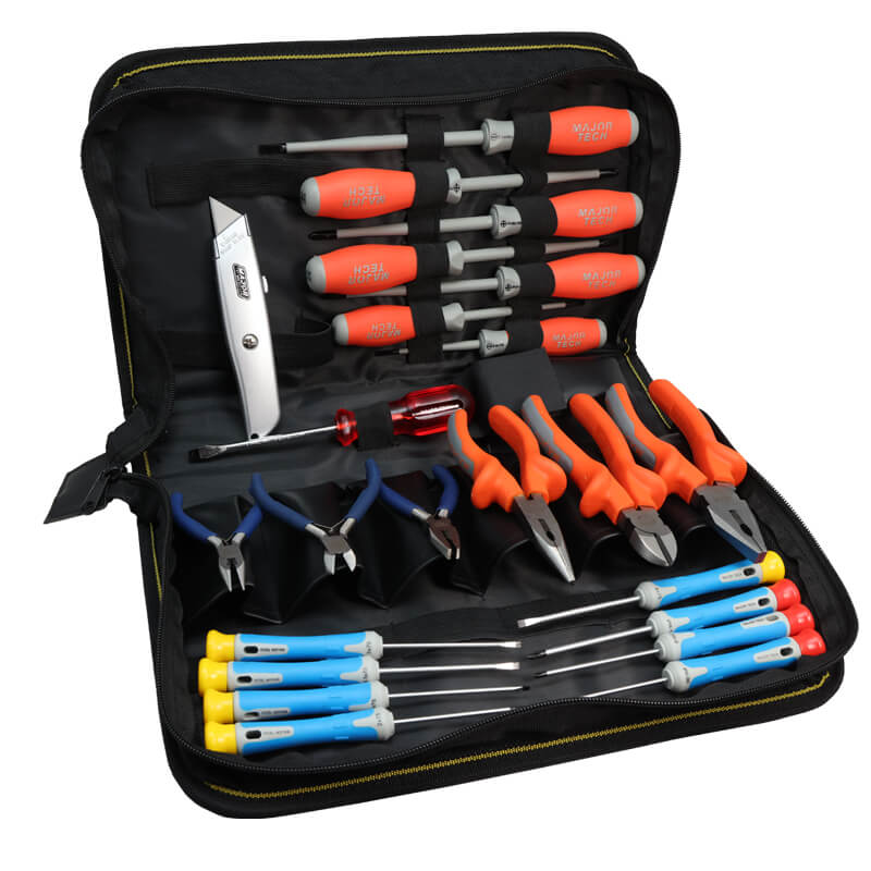 The Major Tech TKE1217N is a basic electronic service kit that includes a combinations plier, diagonal cutting plier, long nose plier, mini combination plier, mini diagonal cutting plier, mini long nose plier, utility knife, precision screwdriver set and a 1000V screwdriver set.