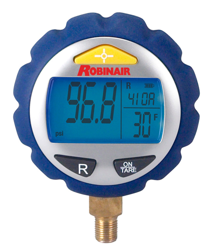 Robinair's new Digital Gauges (P/N 11910, 11920) automatically perform pressure/temperature calculations for up to 17 different refrigerants. Their compact design, large display, and bright backlight provide technicians with accurate readings and ease of use in any location. Compatible with numerous manifolds. Low pressure (0-350 psi) and high pressure (0-800 psi) gauges available.